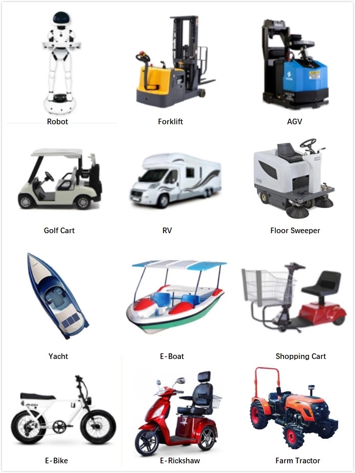 | програми | Візки для гольфу, електронавантажувачі, тихохідні автомобілі; AGV, електричний мотоцикл; Екскурсійний автомобіль; автофургон, триколісний велосипед, електромобілі, електромобілі Інвалідні візки, Електросистеми, Джерела безперебійного живлення, Системи накопичення сонячної енергії, ЧОВНИ |